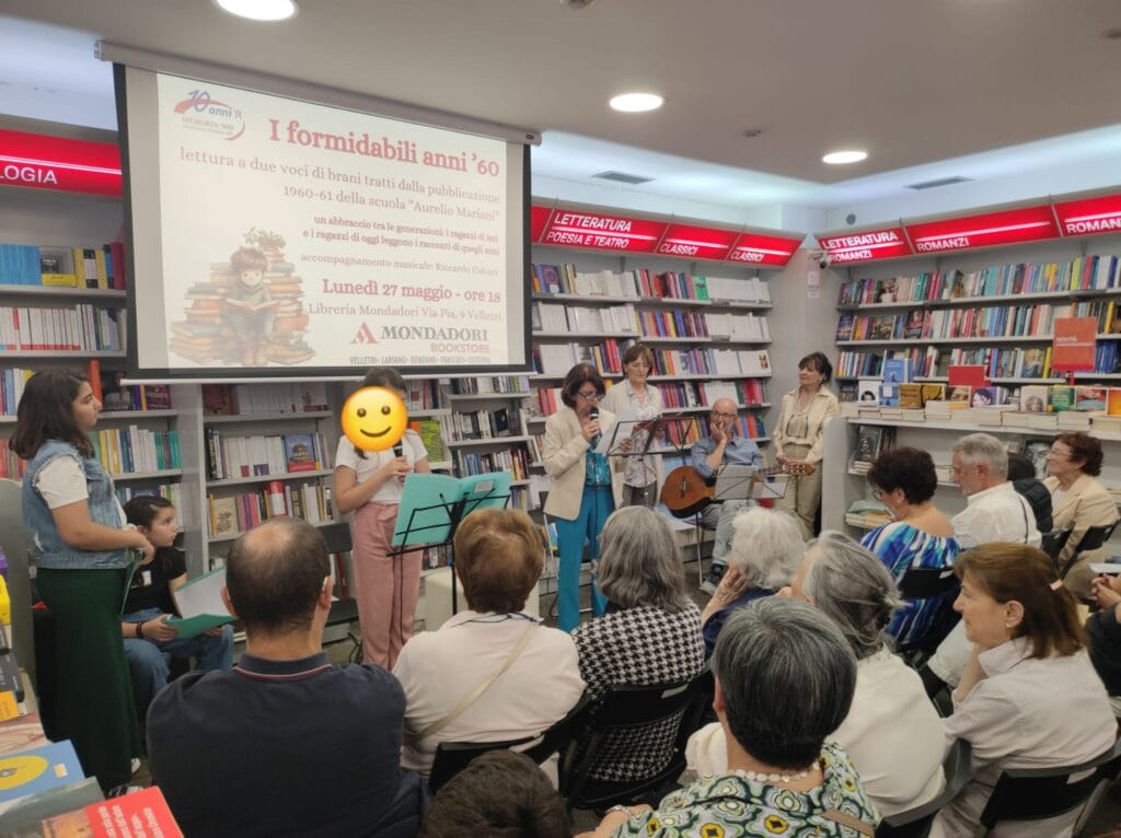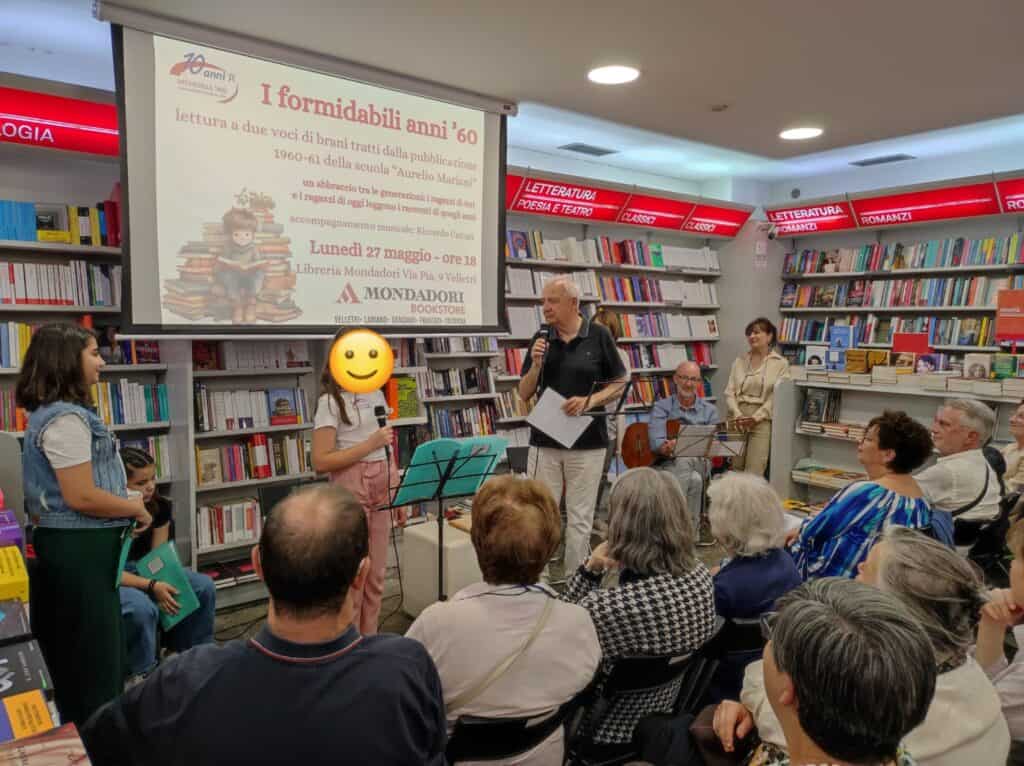 Pomeriggio di intensi ricordi alla Mondadori Bookstore di Velletri, dove si è svolto l’evento intitolato “I formidabili anni ’60” organizzato dall’Associazione Culturale Memoria ‘Novecento’900. A fare gli onori di casa la presidente, Emanuela Treggiari, che ha tracciato un dettagliato quadro della situazione storica politica e sociale degli anni sessanta. Un’epoca in cui si è visto, anche a Velletri, un vivo e attivo fermento culturale e studentesco. La storica e docente Antonietta Lucchetti ha quindi introdotto le letture a due voci: sono stati letti – dagli autori stessi – dei brani contenuti in un annuario scolastico risalente al 1960-61 e stampato a cura della scuola media “Aurelio Mariani” di Velletri (in rappresentanza della quale era in sala la vice-preside, professoressa Maria Rosaria Perillo).