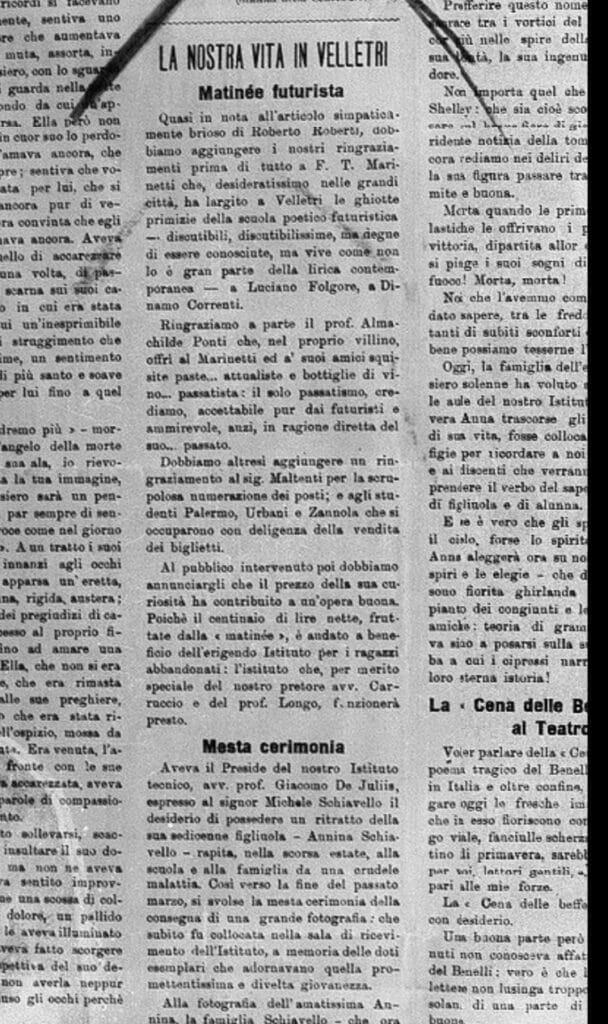 Come riferisce il prof. Marco Nocca, docente di Storia dell’Arte all’Accademia di Belle Arti di Roma, a Velletri, in questa residenza di campagna, sono stati depositati per anni i sette “Libroni”, vero e proprio Archivio globale del Futurismo, prima che le preziose carte emigrassero a Yale, acquisite dall’università americana. Proprio tra queste carte, digitalizzate completamente e disponibili in rete, un articolo pubblicato ne “Il Goliardo” (senza data) riporta, in “La nostra vita in Velletri” notizia di una matinée poetica futurista tra le campagne velletrane. Organizzata dal dottor Almachilde Ponti nel suo villino, allietata da vino “passatista” e paste “attualiste”, la mattinata vede il fondatore del Futurismo esibirsi, mostrando “le primizie” della scuola poetica futurista, insieme a Luciano Folgore, e Dinamo Correnti. Lo spettacolo ricava cento lire, “da devolvere all’Istituto per ragazzi abbandonati” che l’avv. Carraccio e il prof. Longo stanno per realizzare nella città laziale.