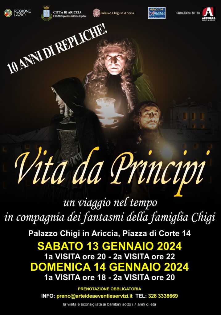 Il week end successivo invece torna “Vita da Principi”, viaggio nel tempo fra le stanze di Palazzo Chigi: sabato 13 e domenica 14 gennaio. La visita teatralizzata, al decimo anno di repliche con grande successo, sarà possibile il sabato alle 20 e alle 22 e la domenica alle 18 e alle 20. Per informazioni e prenotazioni si può inviare un’email a preno@arteideaeventieservizi.it o contattare il numero 3283338669 (anche whatsapp)
