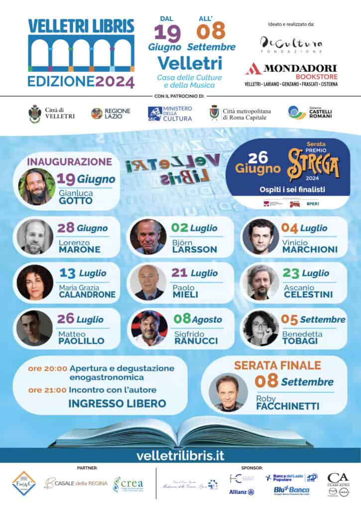 “Velletri Libris” è ideato e realizzato dalla Mondadori Bookstore Velletri-Lariano-Genzano-Frascati-Cisterna e dalla Fondazione De Cultura e gode del patrocinio di Ministero della Cultura, Regione Lazio, Città Metropolitana di Roma Capitale, Comune di Velletri e Sistema Castelli Romani, in collaborazione con Fondarc. Partner enogastronomici sono Casale della Regina e CREA Viticoltura-Enologia, mentre i main sponsor per l’edizione 2024 sono Allianz FC Group 001, Clinica Madonna delle Grazie, Banca Popolare del Lazio e Class Auto. Per scoprire tutte le novità di “Velletri Libris 2024” sono attivi il sito ufficiale velletrilibris.it e i canali Social, sui quali saranno prontamente inseriti tutti gli aggiornamenti su ogni singola serata.