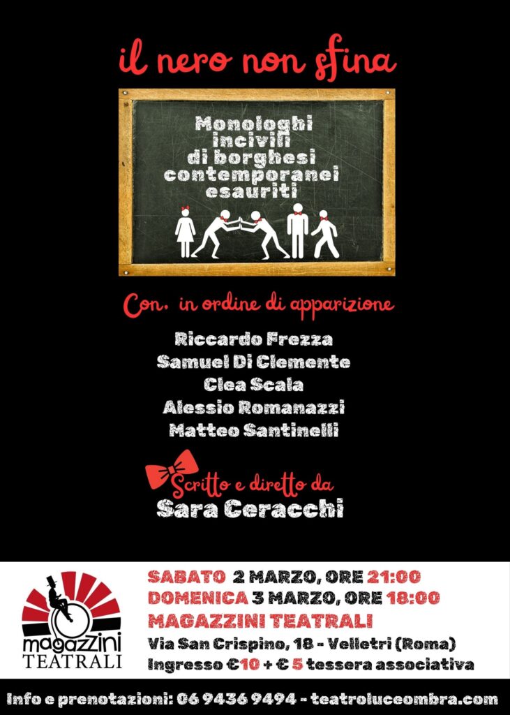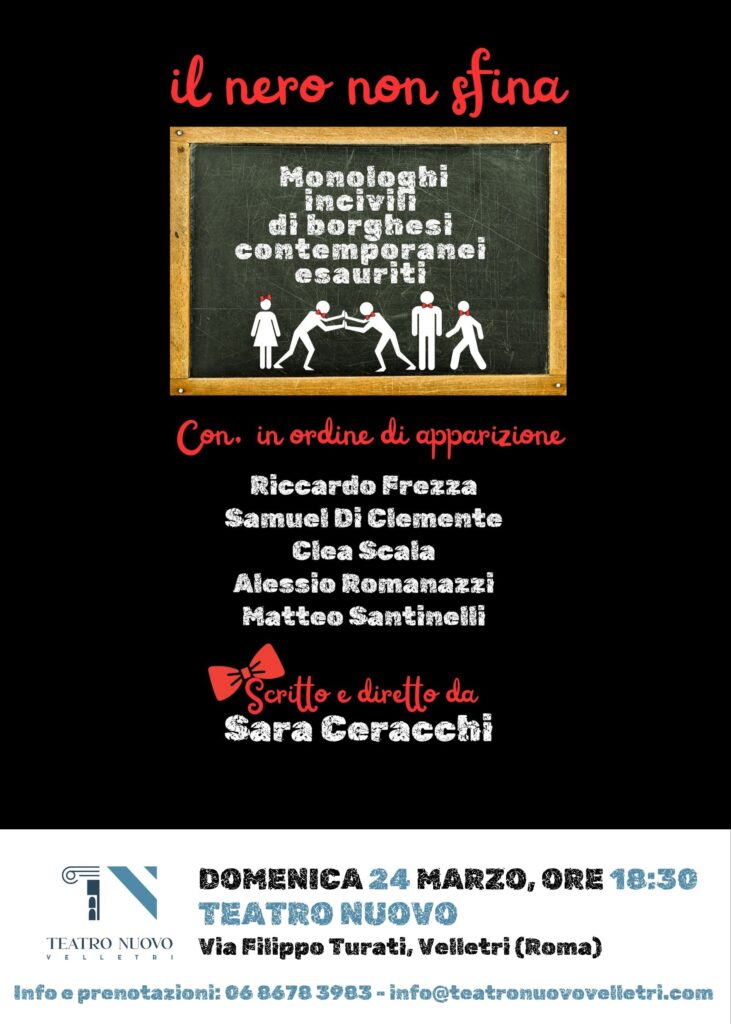Ogni performance sarà intervallata da celebri brani musicali che anticipano le tematiche dei monologhi, o ironizzano su di esse, e dalle interazioni tra l’attore impegnato nel monologo e il resto del cast. Proprio il cast è composto da attori professionisti provenienti da rinomate scuole di recitazione: Riccardo Frezza, della compagnia “La Stazione” di Claudio Boccaccini, e Samuel Di Clemente, del Laboratorio di Arti Sceniche di Massimiliano Bruno, già facenti parte dell’abituale gruppo di lavoro di Sara Ceracchi; ancora Clea Scala, dall’Accademia d’Arte Drammatica Pietro Scharoff, Alessio Romanazzi, dalla compagnia del Teatro della Luce e dell’Ombra di Gennaro Duccilli e Matteo Santinelli, diplomato all’Accademia d’Arte Drammatica Silvio D’Amico. L’appuntamento è triplice, dunque, per un mese di marzo dove sarà impossibile non apprendere che… “il nero non sfina”!
