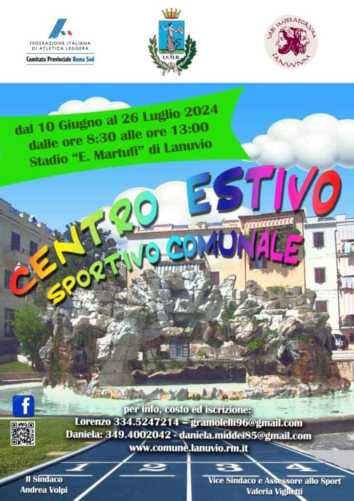Sono aperte le iscrizioni al Centro estivo sportivo comunale in programma dal 10 giugno al 26 luglio a Lanuvio (con orario 8.30- 13) presso lo stadio comunale Martufi. L’iniziativa, organizzata dall’assessorato allo Sport e dal Comitato provinciale di Roma sud della Fidal, è riservata ai bambini di età compresa tra i 4 e i 14 anni.  Sarà concessa precedenza alle iscrizioni richieste dai residenti in Lanuvio o da figli di persone impiegate lavorativamente sul territorio comunale nonché gli utenti segnalati dal servizio sociale comunale.