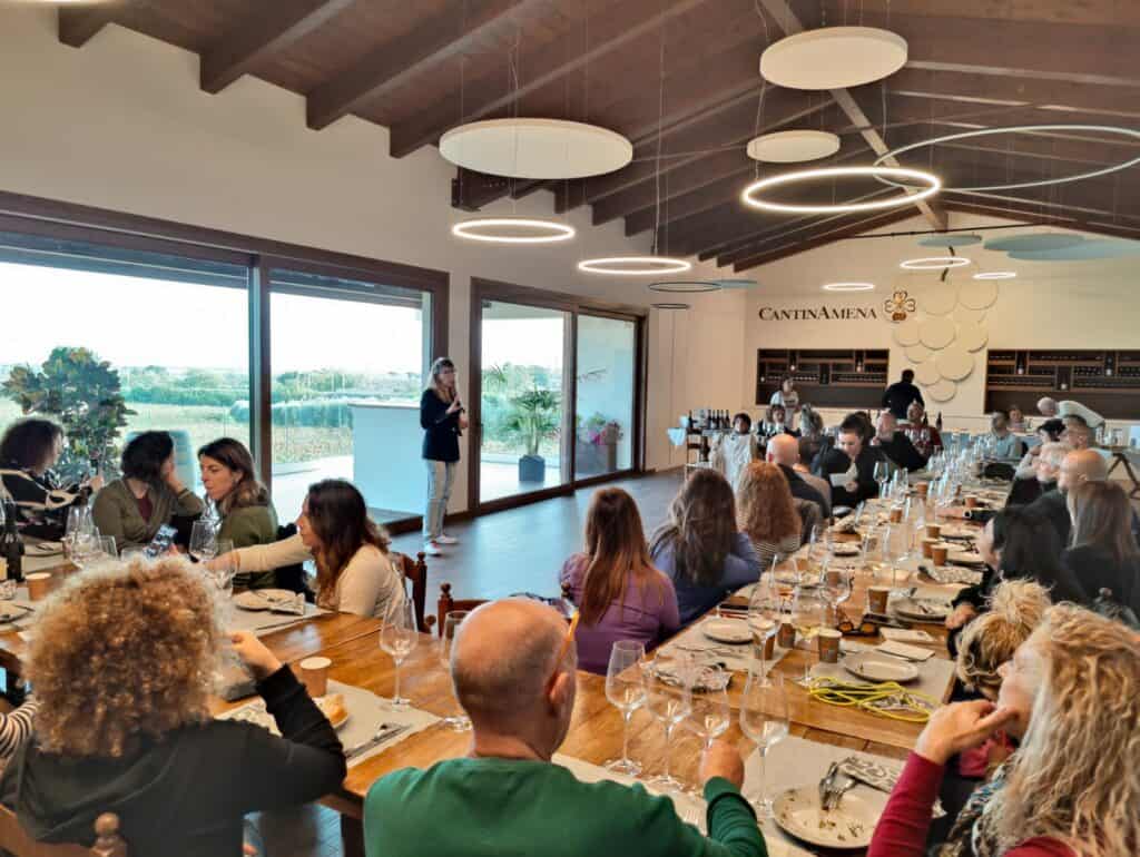 Tra le persone intervenute per la presentazione di “VinoInVigna” 2024-2025 c’era sia chi aveva già aderito alle scorse edizioni, tutti hanno rinnovato in blocco l’adesione tra l’altro, sia tanti altri appassionati che si sono fatti travolgere dall’entusiasmo degli “ambasciatori” che li hanno preceduti e dall’atmosfera che si è respirata da subito durante la giornata. I numeri dicono già alcune cose, i primi iscritti hanno confermato e aumentato il numero di bottiglie “prenotate”, allo stesso tempo i nuovi potenziali iscritti – che hanno tempo fino a fine anno per formalizzare l’adesione – sembrano già in numero simile a chi li ha preceduti facendo praticamente quasi “raddoppiare” i numeri del progetto. Una integrazione che è risultata evidente durante lo scorrere delle ore, cominciando dalla visita alle cantine e al vigneto, accompagnati dall’enologo interno Francesco Boccia, per concludersi con il pranzo durante il quale la proprietaria Silvia Mingotti ha raccontato, anche a nome dei fratelli, i dettagli di “VinoInVigna”. Sommelier, cuochi o semplici bevitori consapevoli, la platea di interessati a realizzare il proprio vino – partecipando alle operazioni in vigna e in cantina – è varia e non prevede vincoli di sorta. Aderendo al progetto si può collaborare alle diverse fasi di preparazione sia in campo sia tra le botti, fino ad arrivare appunto all’imbottigliamento, scegliendo una personalissima e unica etichetta per le bottiglie prenotate. Per ulteriori informazioni si può visitare il sito www.cantinamena.com, dove è presente una sezione specifica per VinoInVigna, oppure seguire l’azienda sui canali Social così da presenziare ai prossimi eventi, a cominciare dagli auguri di Natale previsti con un evento che si terrà il 14 dicembre prossimo. Tutti i vini saranno ovviamente biologici, come lo è del resto la produzione di CantinAmena fin dalla nascita (e ancora prima), e si potrà scegliere come formare la propria “cantinetta” con vini bianchi, rossi o rosati, con quali vitigni ecc. La formula è ormai rodata, per gli appassionati non rimane che mettersi al lavoro.