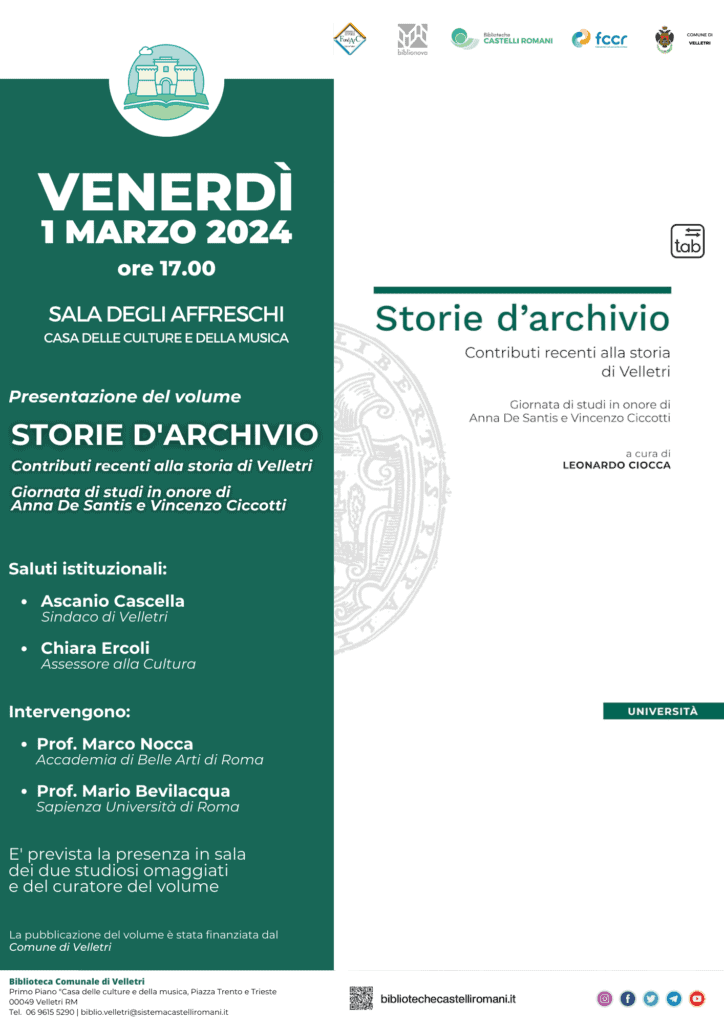 Velletri, si presenta il libro “Storie d’Archivio. Contributi recenti alla storia di Velletri”