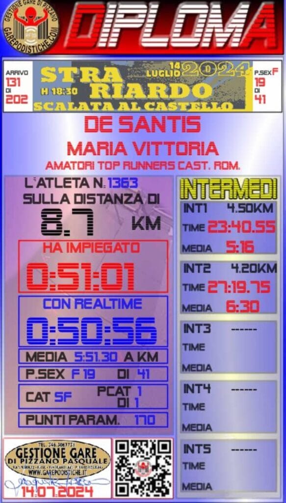 La gara, che ha visto la partecipazione di numerosi runner provenienti da diverse località, ha offerto una cornice ideale per mettere in luce le qualità dei singoli atleti e per celebrare lo spirito di comunità che caratterizza il mondo della corsa. La performance di Maria Vittoria non è passata inosservata e ha suscitato ammirazione tra gli spettatori e gli altri partecipanti. Un’ulteriore conferma del talento di Maria Vittoria De Santis e del valore del team dei Top Runners Castelli Romani, che continuano a scrivere pagine di successo nel panorama delle corse su strada e delle competizioni sportive. Concludere la Stra Riardo – Scalata al Castello con un tempo così eccellente è solo l’ultimo di una serie di successi che promettono di arricchire ulteriormente il palmarès di questa straordinaria atleta.