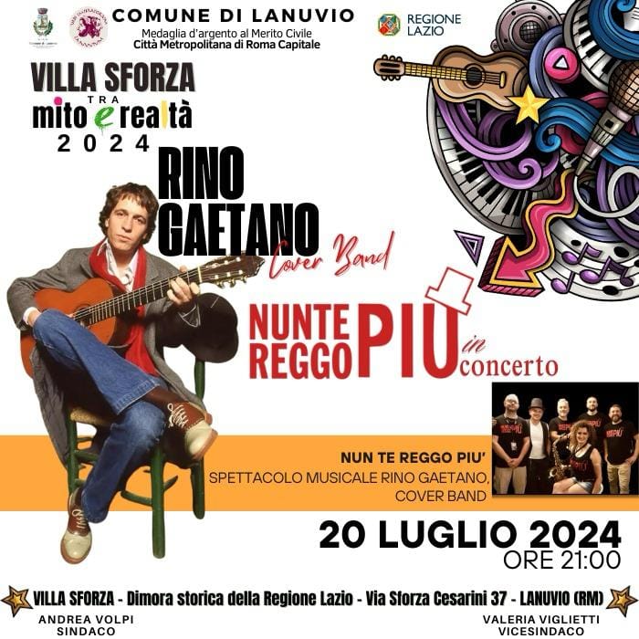 Doppio appuntamento culturale questo fine settimana a Lanuvio. Nell’ambito del progetto “Villa sforza: tra mito e realtà” si svolgeranno due serate(ingresso gratuito) all’insegna di musica e teatro. Sabato 20 luglio alle ore 21 sul palco allestito nella dimora storica si esibirà la cover band di Rino Gaetano “Nunte Reggo Più”, mentre domenica 21 sempre alle ore 21 andrà in scena lo spettacolo di teatro dialettale dal titolo “Pareva Mejo… Mapperò invece era peggio…” a cura della compagnia “Grezzi per caso”.