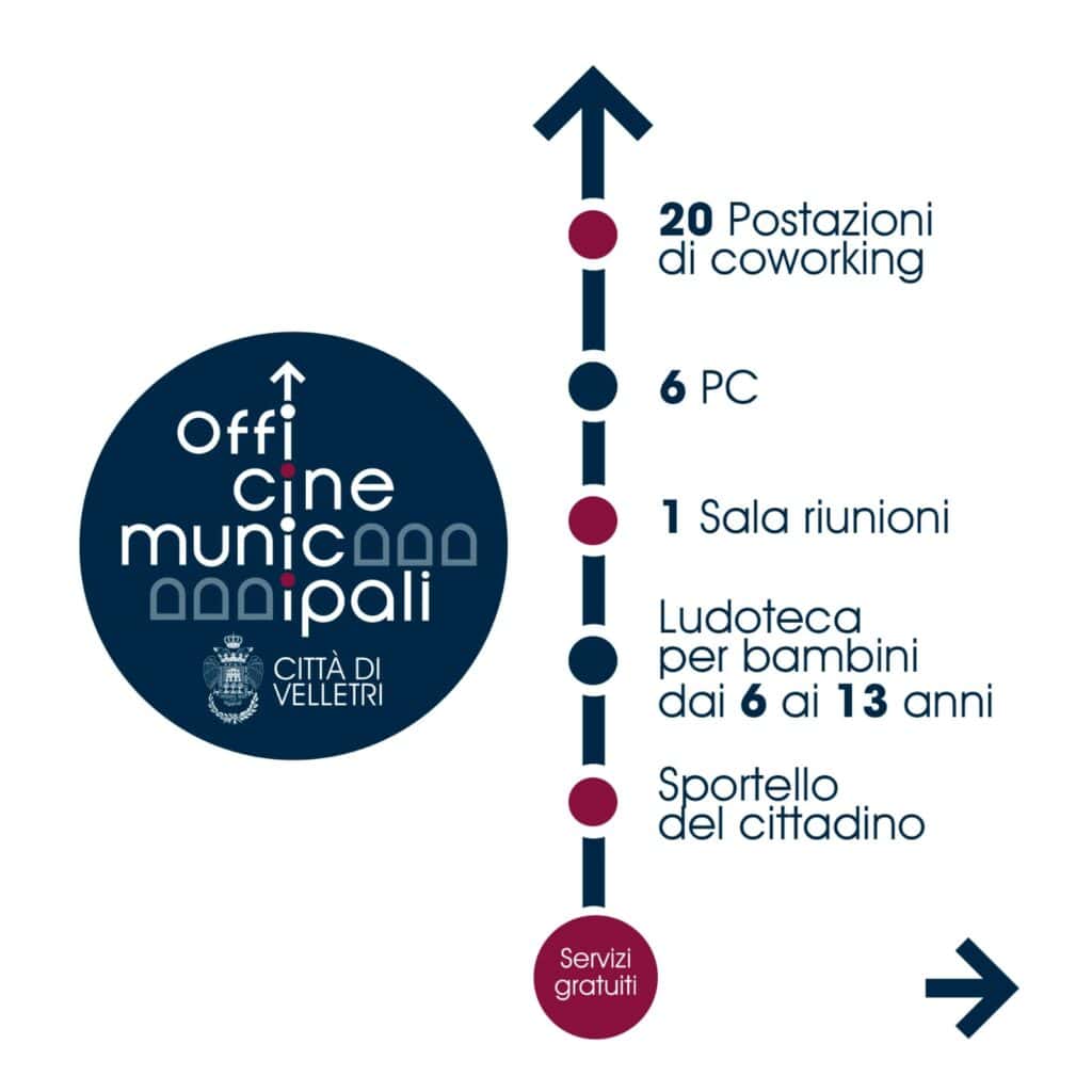 La realizzazione del Progetto Officine Municipali del Comune di Velletri, come detto, ha previsto la creazione di 20 postazioni di co-working in grado di offrire strumentazione di lavoro adeguata e accessi trasparenti per gli utenti. Le postazioni di lavoro saranno organizzate in modo efficiente e verranno fornite di tutte le attrezzature necessarie (scrivanie, sedie ergonomiche, computer, connessione Internet ad alta velocità, stampante e servizi di telefonia).
