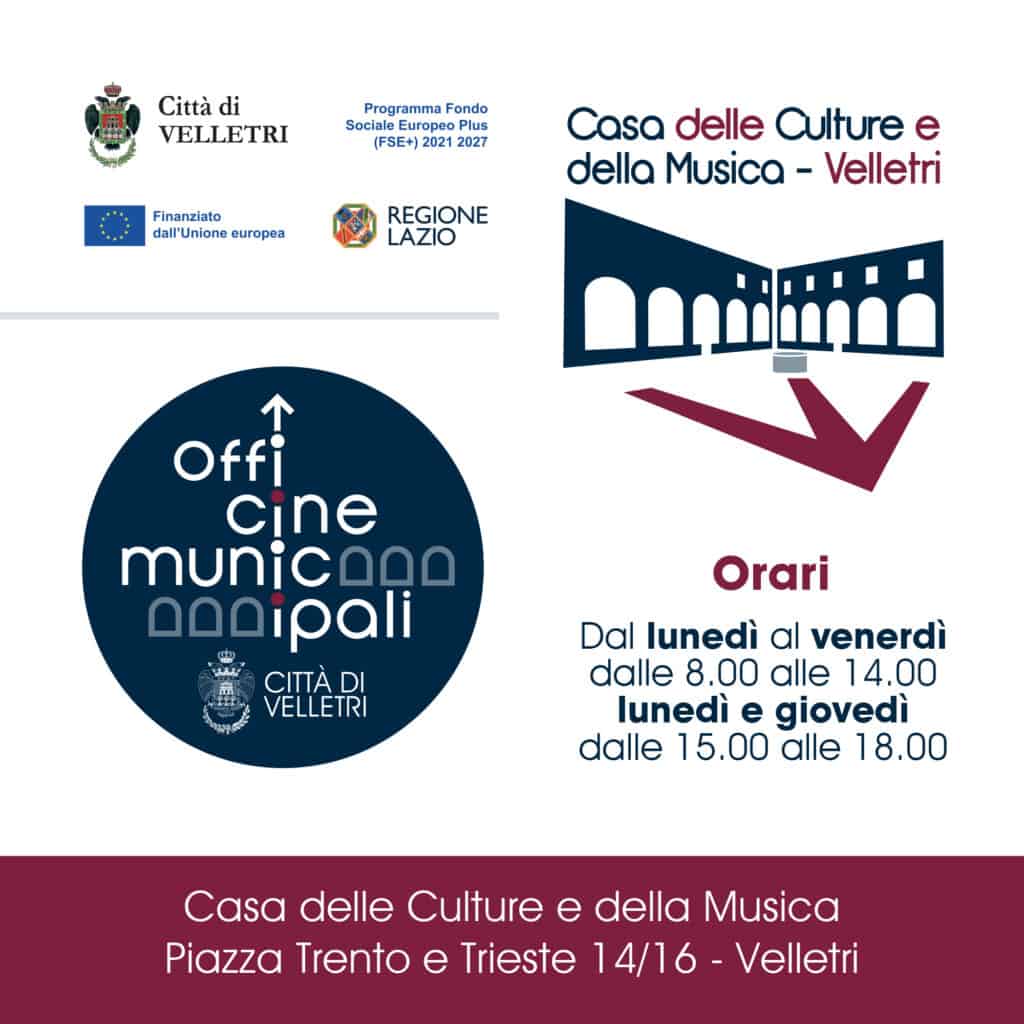 Mercoledì 4 dicembre, alle 17.30, alla Casa delle Culture e della Musica prenderà ufficialmente il via il progetto delle “Officine Municipali Città di Velletri”. Un percorso finanziato dall’Unione Europea e patrocinato dalla Regione Lazio, nell’ambito del programma Fondo Sociale Europeo Plus (FSE+) 2021-2017, e fortemente voluto dall’Amministrazione Comunale veliterna.