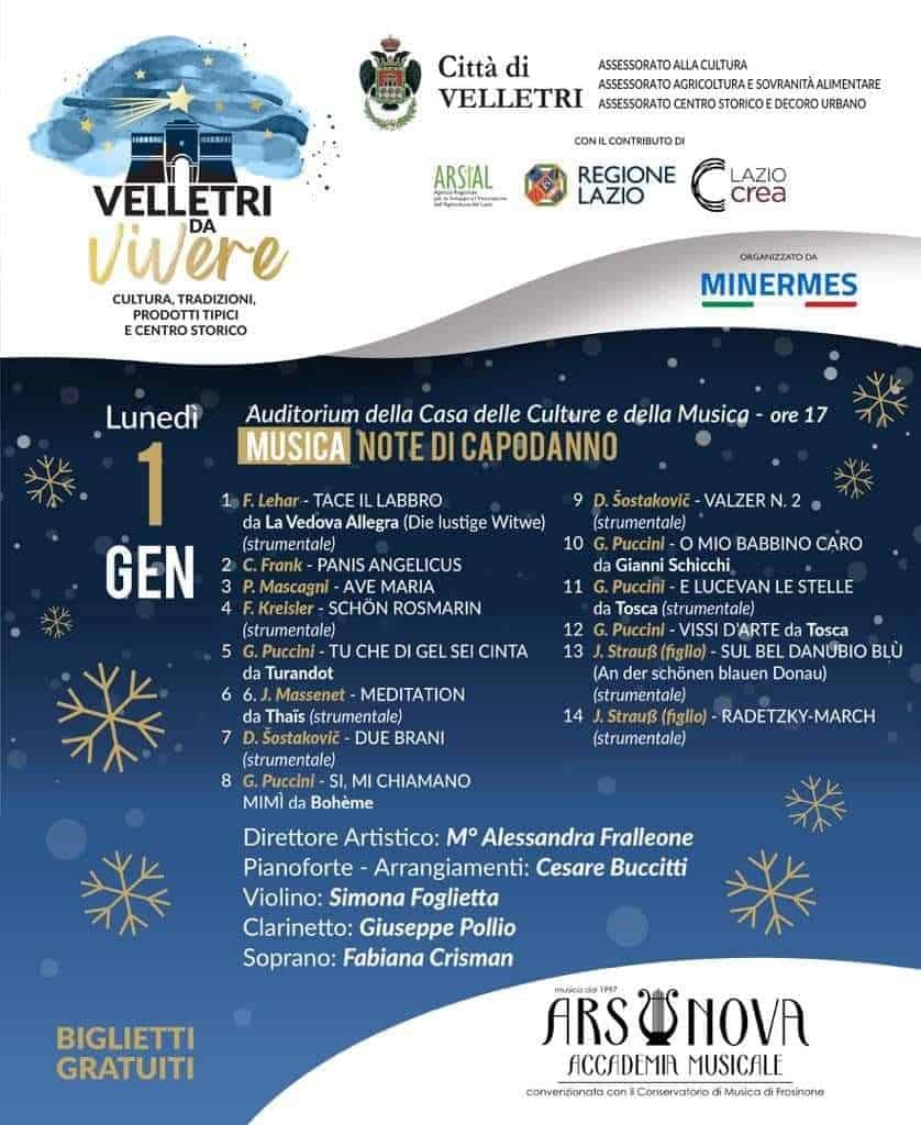 Il Sindaco di Velletri, Ascanio Cascella in merito al concerto di Capodanno presso la Casa delle Culture e della Musica a Velletri, ha così commentato: “Il primo concerto di Capodanno della città di Velletri, presso la Casa delle Culture e della Musica, è stato un successo. Iniziamo il nuovo anno accompagnati dalle meravigliose note di brani memorabili. Con l’occasione rinnovo i miei migliori auguri a tutti i concittadini per un sereno 2024”.