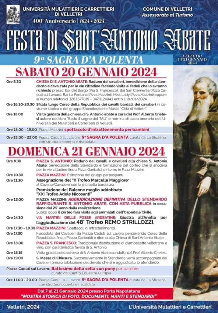 Come ogni anno l’università dei Mulattieri e Carrettieri di Velletri organizza i Festeggiamenti in onore di Sant’Antonio Abate, Venerato nell’omonima Chiesa, i Festeggiamenti avranno inizio il giorno 14 Gennaio con il programma Religioso che prevede Celebrazioni Eucaristiche, una fiaccolata e il favore “falò” in onore di Sant’Antonio. Proseguiranno poi Mercoledì 17 Gennaio dove l’effige del Santo sara’ portata nelle campagne veliterne in visita alle famiglie che ne avranno fatto richiesta. Il giorno 20 Gennaio lo stendardo Stendardo visiterà le famiglie e le attività commerciali del Centro Storico, fino ad arrivare a Domenica 21 Gennaio con il programma dei festeggiamenti Civili. Programmazione, quest’ultima, ricca di appuntamenti di rilevante importanza, iniziando con l’ormai storica cavalcata dove lo Stendardo accompagnato dai cavalieri insieme ai gruppi folk e alle bande musicali sfilerà lungo Corso della Repubblica. A conclusione della cavalcata, in Piazza Mazzini assisteremo a all’assegnazione del X Trofeo Marcella Maggiore al cavallo/cavaliere con la più bella bardatura, all’assegnazione del XXI Trofeo Adele Nicosanti per il balcone meglio addobbato, all’aggiudicazione dello Stendardo raffigurante Sant’Antonio Abate con asta pubblica. A seguire l’effigie del Santo verrà portata in visita ai malati del nosocomio veliterno Paolo Colombo. Nel pomeriggio lungo Via Martiri delle Fosse Ardeatine si svolgerà la giostra dell’anello per l’aggiudicazione del 48°esimo trofeo Remo Strillozzi. A seguire in Piazza San Francesco avverrà la Tradizionale favata di Sant’Antonio e la distribuzione gratuita di ciambellette Velletrane e vino. per tutta la giornata di Domenica 20 Gennaio presso Piazza caduti sul Lavoro si svolgerà la 9° edizione della sagra della polenta curata dalla “Sfizzeria” in struttura coperta e riscaldata. e per la gioia dei più piccoli anche quest’anno si svolgerà il battesimo della sella con pony (gratuito) per bambini e ragazzi curato dal centro equestre olimpia,. Alle ore 19:00 presso la Chiesa di Sant’Antonio Abate il Vescovo Emerito della Diocesi Anagni / Alatri S.E Lorenzo Loppa celebrerà la Santa Messa di chiusura dei Festeggiamenti. Dopo la celebrazione eucaristica lo strato del Santo verrà consegnato all’aggiudicatario dell’asta , in oltre dal giorno 7 al giorno 21 Gennaio 2024 , presso porta Napoletana si terrà una mostra fotografica inerente alle vecchie edizioni della festa dove saranno esposti anche i vecchi manti.