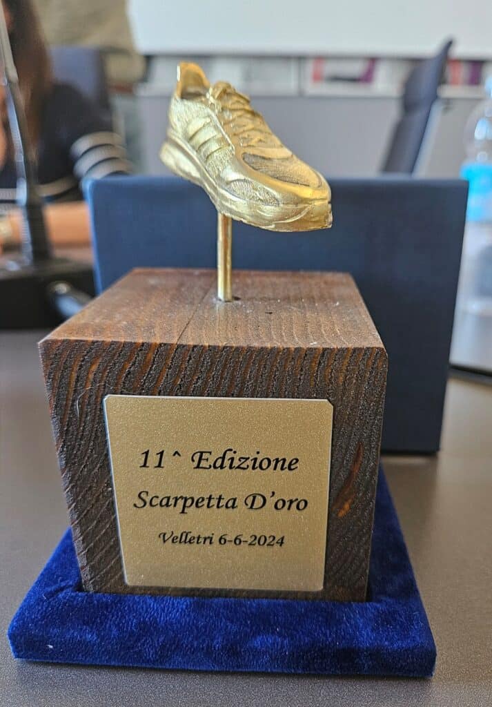 Valerio Di Cocco ha ricevuto la “Scarpetta d’Oro” 2024, rinnovata nella sua fattura dal Maestro Orafo Leo Duilio che, ingrandendola e modificandone la forma ha inteso aggiungere valore ad un premio che negli anni sta diventando anch’esso mèta da raggiungere dai giovani sportivi. Di Cocco, già attenzionato dal nostro Club nelle scorse edizioni, ha confermato di essere un grande campione di Parakarate in quest’annata che lo ha visto protagonista a livello internazionale: Vicecampione del Mondo ai Campionati Mondiali in Ungheria (2023) e medaglia di bronzo ai Campionati Europei in Croazia (2024).